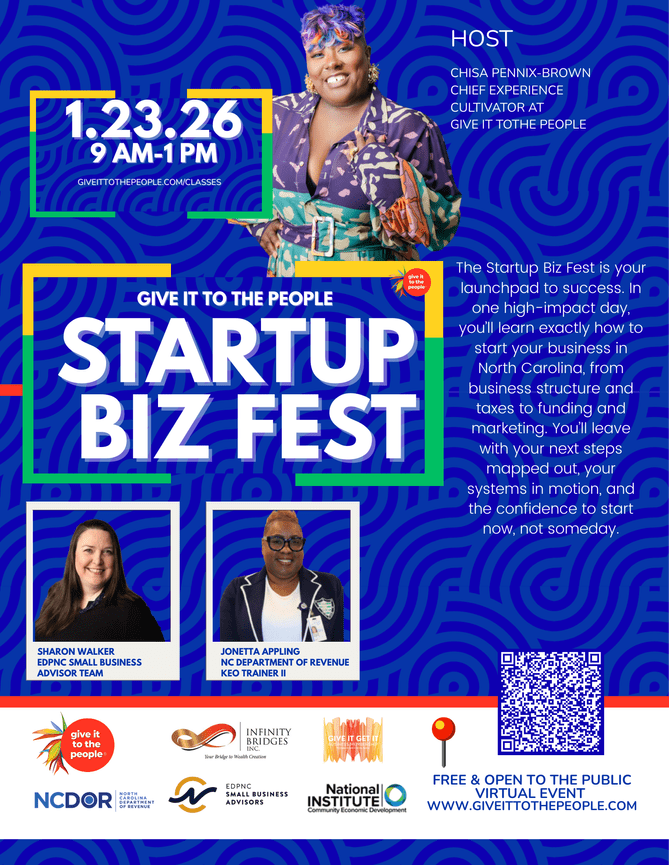 The Startup Biz Fest is your launchpad to success. In one high-impact day, you’ll learn exactly how to start your business in North Carolina, from business structure and taxes to funding and marketing. You’ll leave with your next steps mapped out, your systems in motion, and the confidence to start now, not someday.