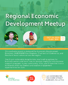 Don't miss the Regional Economic Development Meetup on October 24. 2024 from 11 am-1:00 pm at LC Coworking 100 Core Street, Durham, NC 27703.
