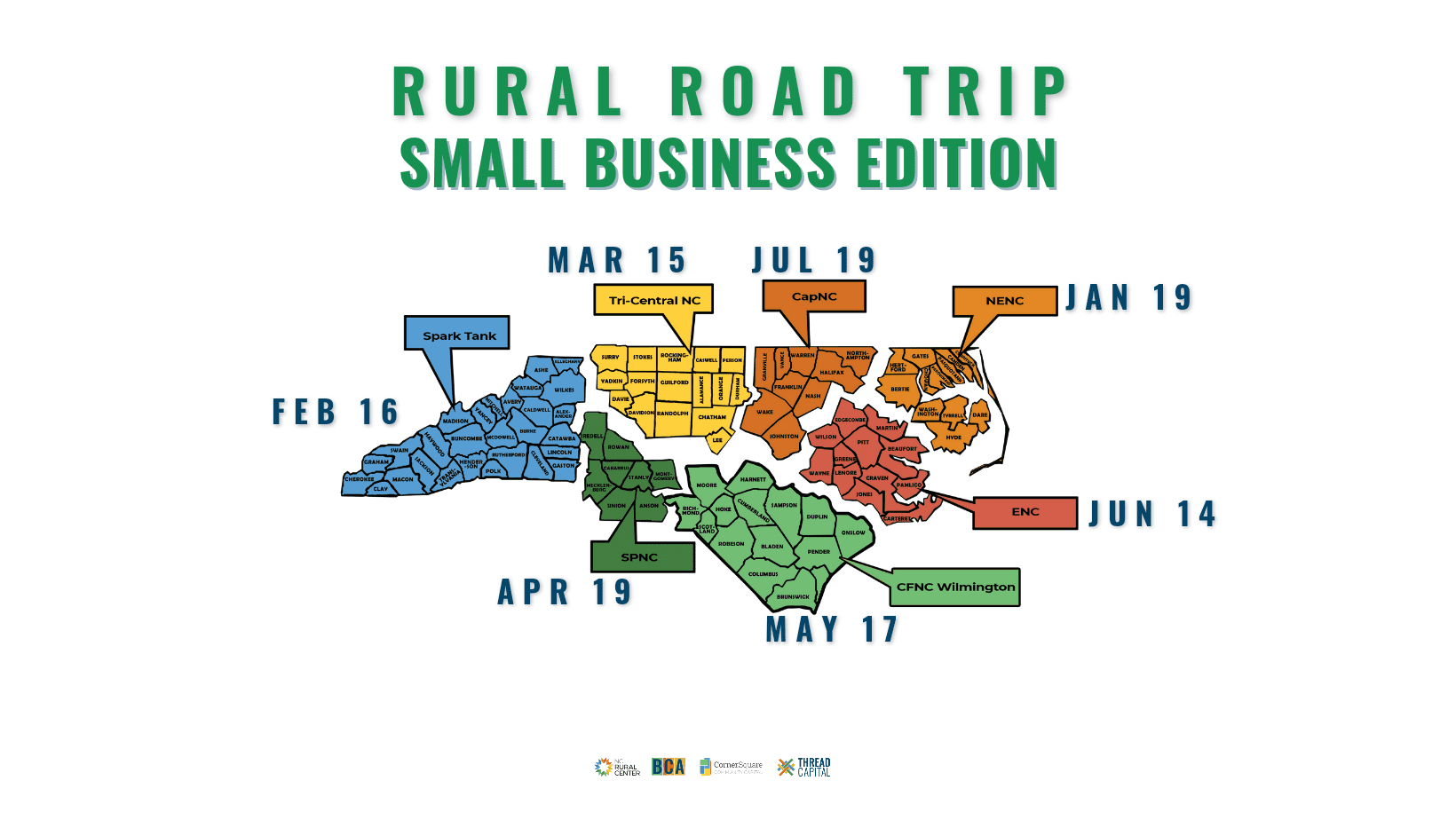 The Rural Road Trip Small Business Edition is a statewide initiative powered byThe NC Rural Center, CornerSquare Capital, NC Invest, Thread Capital, and the Business Connectivity Alliance in uniting rural areas and surrounding counties, fostering economic growth, and celebrating the entrepreneurial spirit. The events will bring together Business Support Organizations (BSOs) from across the state to network, share resources, and collaborate on initiatives with business owners. By fostering collaboration and communication among BSOS In tandem with the business owners, we hope to create a more connected and accessible ecosystem for business owners to navigate and access the support they need to grow and succeed. You can get involved in many ways: 1. Attend the event. (choose your dates & regions, which are listed in the photo below) 2. Be an Exhibitor (no selling) only exhibiting your products & services. 3. Sharing the event with your network! We have a media kit (one for each region) and you can get all our graphics and content to share with your colleagues, clients, and customers in your region. 4. Watch the pre-recorded informational session if you need more information. |